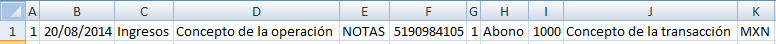 Este ejemplo sólo muestra información de una transacción, como podrá notar los campos del cheque, transferencia y CFDI se encuentran vacíos.