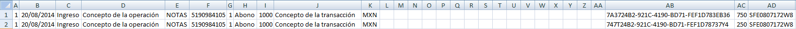 El siguiente ejemplo contiene datos de 2 CFDI recuerde que puede incluir información de "N" CFDI por lo que cada uno de ellos representará una fila. Así mismo los campos de la transferencia y cheque se encuentran vacíos.