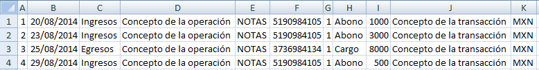 Nótese que el siguiente ejemplo contiene 6 filas las cuales corresponden a 2 pólizas con una transacción; sin datos de cheques/transferencias/CFDI (campos vacíos).