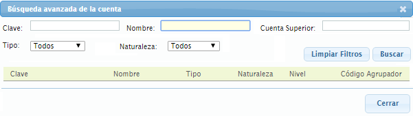 Puede capturar los datos de búsqueda de la cuenta por clave, nombre, cuenta superior, tipo y naturaleza.