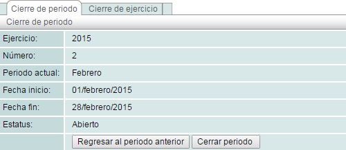 La opción "Regresar al periodo anterior" nos permite modificar un periodo ya cerrado, para habilitar esta opción lea la sección de "Configuración de cuentas."