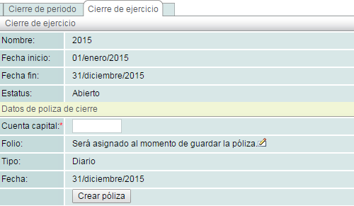 Para poder cerrar un ejercicio, es necesario crear una póliza de cierre con una cuenta de capital, la cual contiene la información contable.