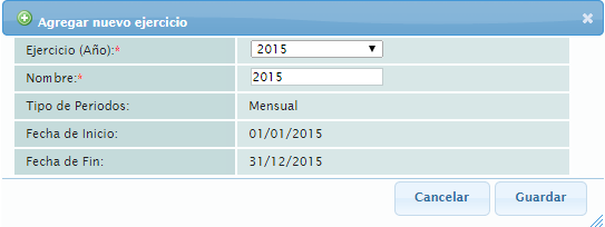 Para crear nuevo ejercicio es necesario capturar el ejercicio (año) y el nombre que se le dará al mismo para su identificación, ya que en automático el sistema carga el tipo de periodos y las fechas de inicio/fin.