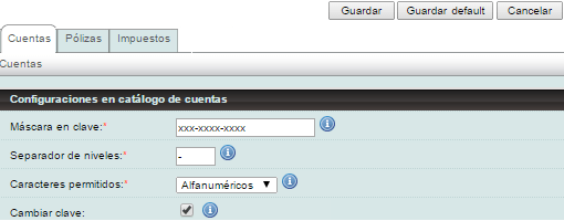 - Máscara en clave: es la manera en la que se muestra la clave al momento de capturarla (por ejemplo si define en esta parte que su clave sea así xxx-xxxx, al momento de crear una cuenta se esperará que sea así 001-0001).