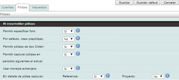 - Por defecto, crear prepólizas: al capturar una póliza el sistema le permite generarla como póliza o prepóliza, si selecciona "Sí" por defecto será prepóliza, si selecciona "No" por defecto será póliza.