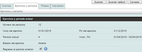 En esta pestaña encontrará datos informativos del número de periodo, inicio y fin del ejercicio, periodo actual así como el estado del ejercicio.
