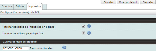 - Cuenta de flujo de efectivo: la cuenta de flujo de efectivo así como sus subcuentas en la captura de líneas de póliza al ser seleccionadas habilitarán el desglose de impuestos automáticamente.