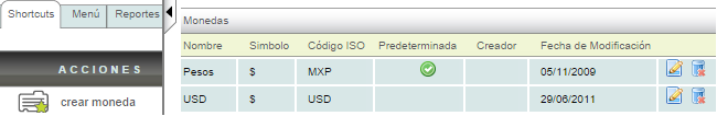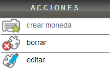 También puede editar, borrar o crear moneda, dando click en la moneda, la cual aparecerá del lado izquierdo del menú "Acciones".