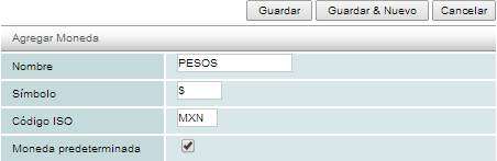 Crear moneda: para crear una nueva moneda, de click en el menú "Acciones" en "Crear moneda", solo capture nombre, símbolo, código ISO y de click en "Guardar":