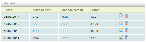 Ya capturados los tipos de cambio, el sistema permite filtrarlos por Moneda base, Moneda cambio y Fecha: