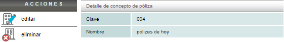 También puede editar o eliminar, al dar click en el nombre del concepto de póliza; aparecerá del lado izquierdo el menú "Acciones" y del lado derecho el detalle: