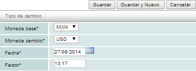 Nuevo: para capturar un nuevo tipo de cambio, de click en el menú "Acciones" en la sección "Nuevo" y capture los campos de Moneda base, Moneda cambio, Fecha y Factor (tipo de cambio) y de click en la opción "Guardar".