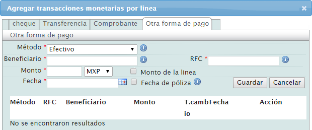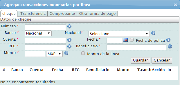 Cheque: todos los datos del cheque son requeridos: número, cuenta, RFC, monto, banco, fecha y beneficiario.