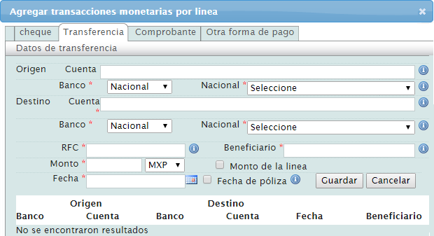 Transferencia: todos los datos de la transferencia son requeridos: banco y cuenta de origen, banco y cuenta de destino, RFC, beneficiario, monto, y fecha.