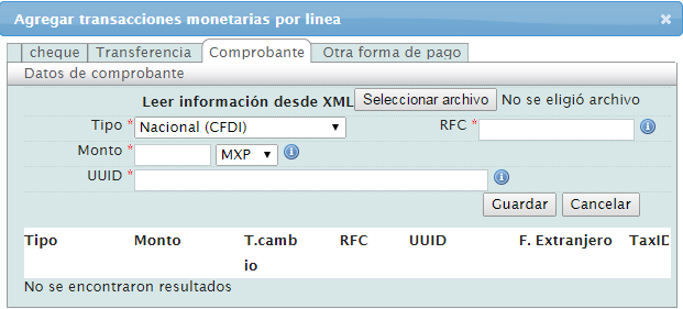 Comprobante: todos los datos del comprobante son requeridos: tipo, UUID, RFC y monto.