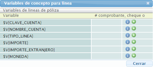 - $V{LINEA_CONCEPTO}: el concepto de la línea, ej. LINEA_CONCEPTO_1 se refiere a la Línea número 1.