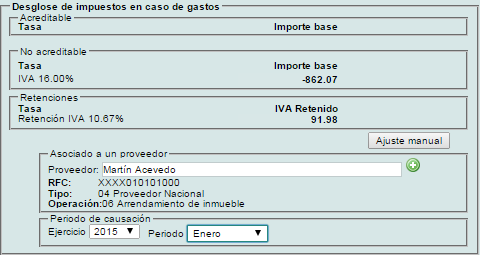 Luego de que se han agregado las líneas, si usted seleccionó la opción de desglose de impuestos, podrá verificar este desglose en la parte inferior derecha de la póliza en el apartado "Desglose de impuestos en caso de gastos". Para realizar el ajuste manualmente, de click en "Ajuste manual".