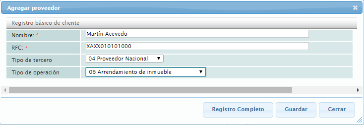 Para capturar un proveedor, de click sobre el icono de "+" y capture nombre, RFC, tipo de tercero y tipo de operación.