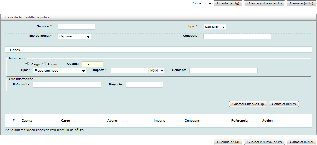 Capture cada uno de los campos. Luego de terminar de captura, de click en "Guardar" o "Guardar y nuevo" que le permitirá continuar con la captura de una nueva plantilla.