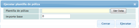 Esta opción se encuentra en la pantalla principal pólizas del lado izquierdo, en el menú "Acciones". Para ejecutar una plantilla, solo capture el nombre de la plantilla o seleccione "ver lista", después capture el importe base y de click en "Ejecutar".