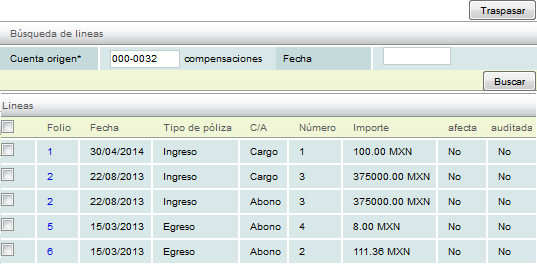 Esta opción se encuentra en la pantalla principal pólizas, al lado izquierdo en el menú "Acciones", solo es necesario seleccionar la póliza y al capturar la cuenta origen, en automático se mostrará el apartado cuenta destino, capture el valor y de click en “Traspasar”.