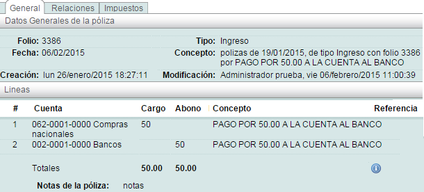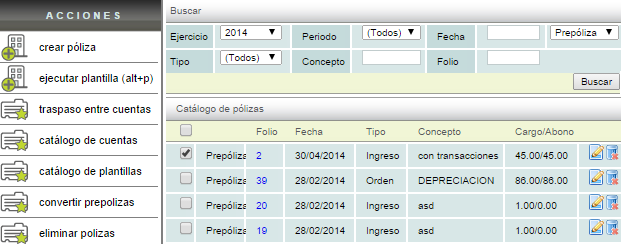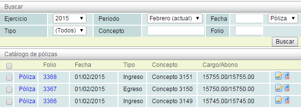 Pólizas capturadas: las pólizas capturadas se muestran en la pantalla principal "Pólizas" y a través de la opción "Buscar", además puede filtrarlas por ejercicio, periodo, fecha, tipo (ingreso, egreso y diario), folio, concepto, póliza o prepóliza