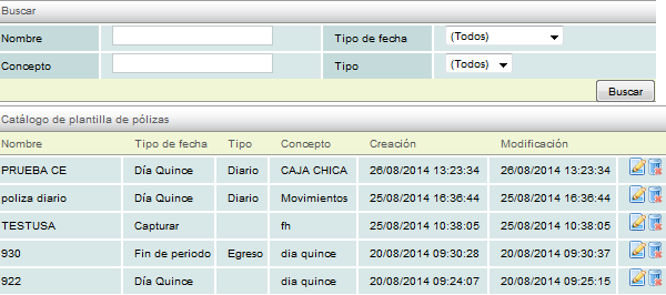 Esta opción se encuentra en la pantalla principal pólizas al lado izquierdo en el menú "Acciones", en esta sección puede buscar una plantilla por: “Nombre”, “Concepto”, “Tipo de fecha” o “Tipo”, ya sea para editarlas o eliminarlas.