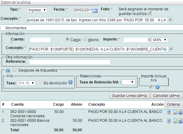 Editar póliza: esta opción permite editar la información de póliza seleccionada, así como agregar, eliminar o editar líneas, una vez modificada, solo de click en "Guardar".