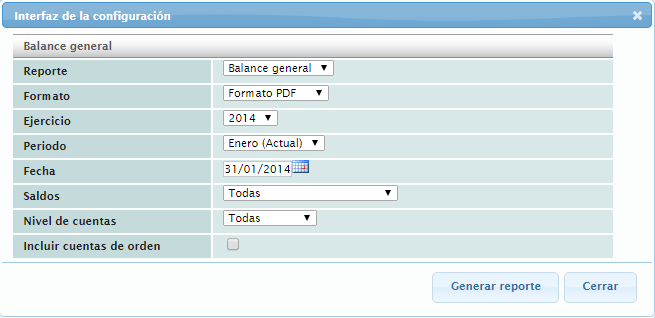 - Fecha: indica la fecha final del período, si requiere el balance general de una fecha anterior seleccionela.