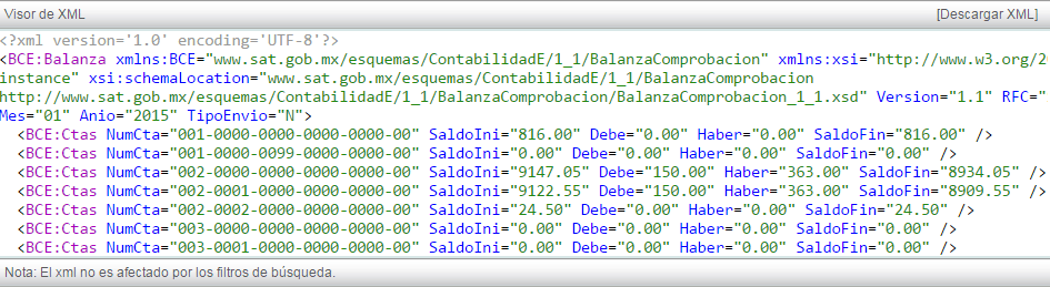 Para ver el XML de su balanza de comprobación, de click en "Ver XML" en la pantalla superior derecha.