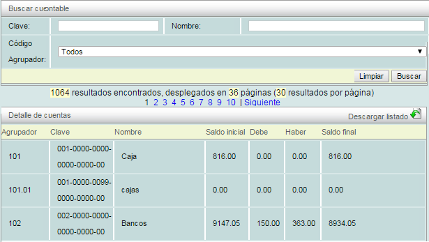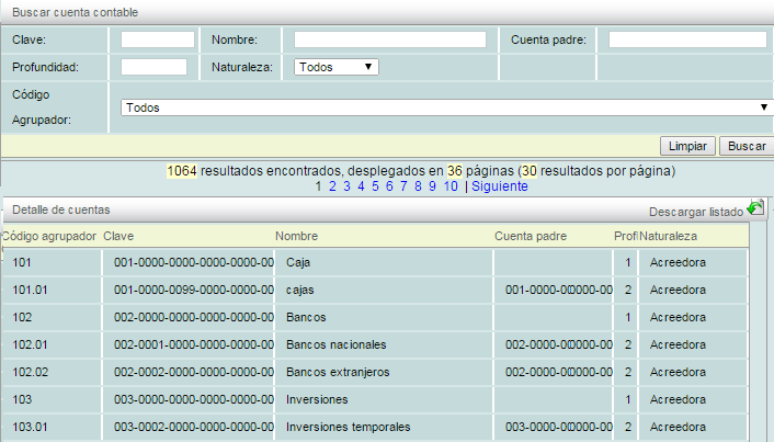 En esta pestaña podrá ver el listado de sus cuentas y podrá filtrarlas por: "Clave", "Nombre", "Cuenta padre", "Profundidad" (1 para cuentas superiores, 2 para cuentas inferiores, 3 para subcuentas de cuentas inferiores y así sucesivamente depende de la ramificación), "Naturaleza" (Acreedora o Deudora) y "Código agrupador".
