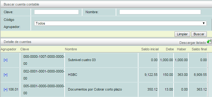 También en esta pestaña podrá ver el detalle de la cuenta con su historial de movimiento en varias columnas: "Agrupador", "Clave", "Nombre", "Saldo inicial", "Debe", "Haber" y "Saldo final".