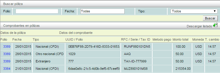 También en esta pestaña podrá ver el detalle de la póliza en las columnas: "Folio", "Tipo", "Fecha" y "Concepto".