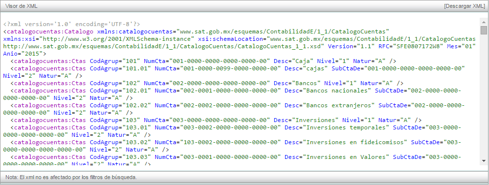 Para descargar su XML generado del catálogo de cuentas, de click en la parte superior derecha en "Descargar XML".