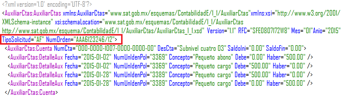 Número de orden: atributo opcional para expresar el número de orden asignado al acto de fiscalización que hace referencia a la solicitud de la póliza. Es requerido para tipo de solicitud = AF y FC.