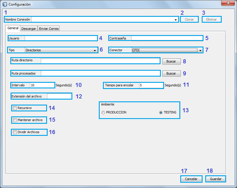 - Tiempo para encolar: field in which the application waiting time is captured before processing the file(s) found in the directory configured in the “Ruta directorio” option.