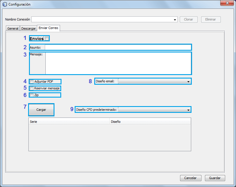 - Cargar: button with which the designs by series and the designs of the captured user's email will be loaded in the "General" tab.