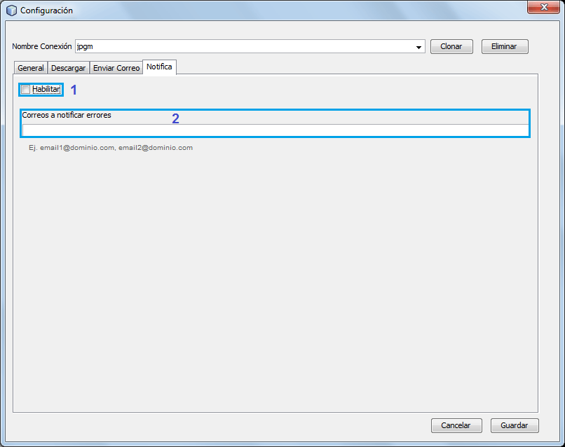 - Habilitar: if this option is enabled, the application will store the information captured in this tab, otherwise the application will understand that you do not want to save any configuration for the email notification.