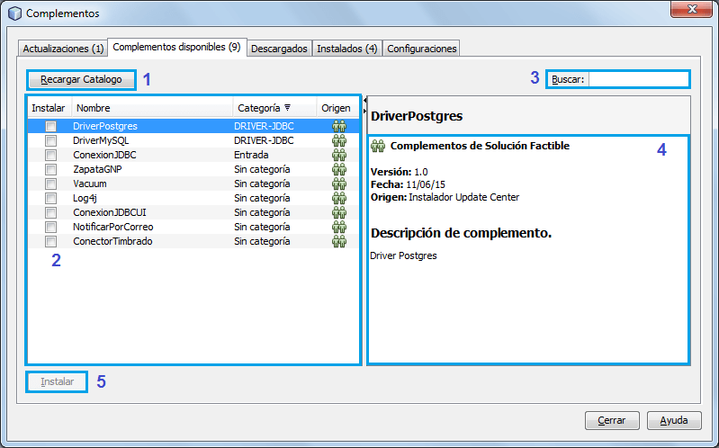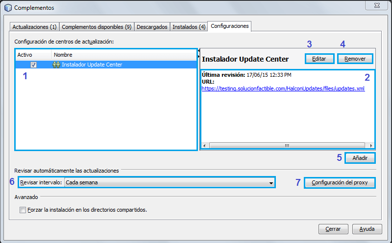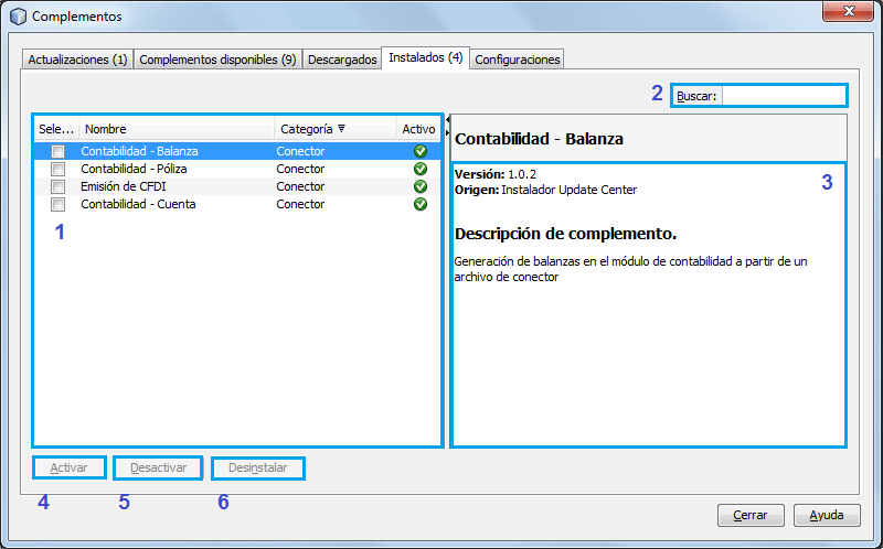 - Complements: Panel where you install, update, and uninstall plugins, as well as configure the application proxy.