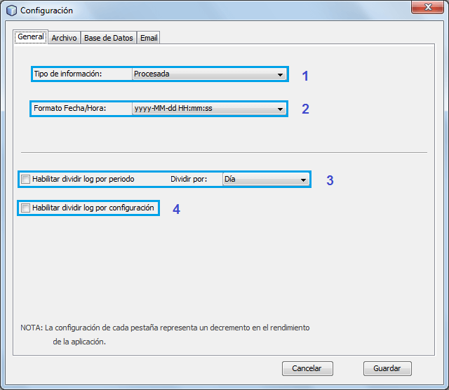 - Habilitar dividir log por periodo: select if the log file is required to be divided by period.