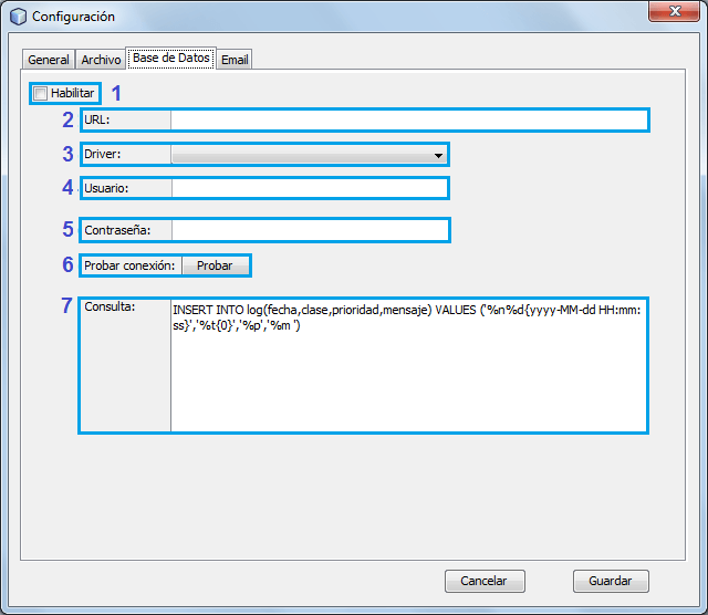 - URL: is the connection string to the database in which you want to store the log. For example: jdbc:postgres://192.168.1.1/base_datos.