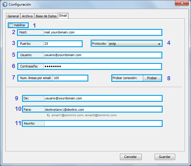 - Número de líneas por email: this field captures the number of lines that will be sent by mail. Every time the application buffer reaches the configured number of lines, the application will release this information by sending it by mail.