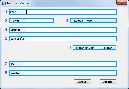 To access the email sending configuration panel you must click on the "Archivo" menu, "Configuración" option, then click on the send email tab.