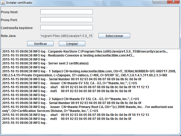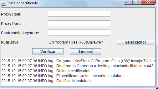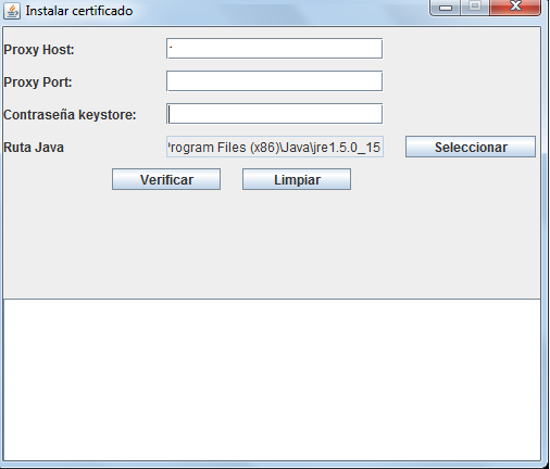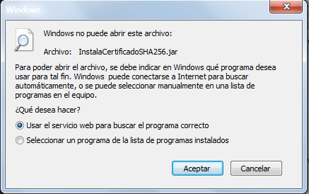 "C:\Program Files (x86)\Java\jre1.8.0_60\bin\java" -jar -Dhttps.proxyHost=Host name o Ip -Dhttps.proxyPort=Puerto InstalaCertificadoSHA256.jar -console - Without proxy: