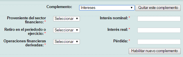 A continuación le mostrará el formulario donde ingresar los datos del complemento, los campos marcados con "*" (asterisco) son obligatorios.