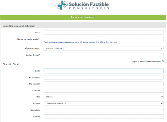 To complete this process, click on the "Facturar sin registrarse" option and continue with the following steps.