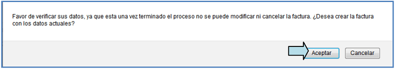 Since our system works in sync with the SAT (Mexican Tax Administration Service), it is important that all the information you provide is truthful and that you ensure the total of your invoice matches the total of the invoice provided to you. To ensure this, you must confirm the creation of the invoice by clicking the "Aceptar" button.