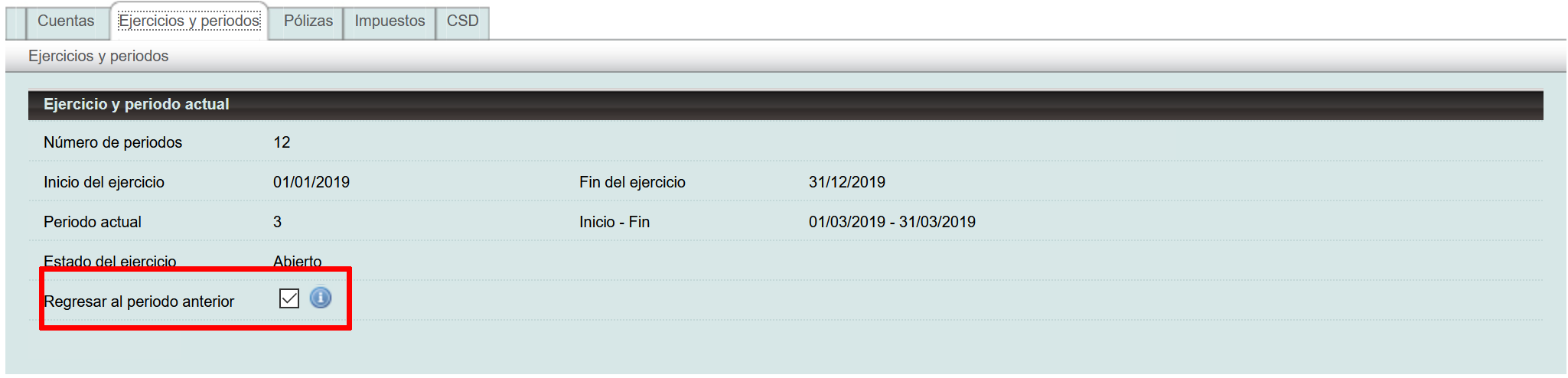 En la pestaña de "Ejercicios y periodos" active la opción "Regresar al periodo anterior" y dé click en "Guardar".