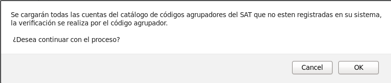 Al dar click el sistema cargará de forma automática el catálogo base que estableció el SAT. Cabe mencionar que usted puede realizar cambios y adecuaciones posteriormente. Dé click en el botón "OK" para aceptar la carga del catálogo.