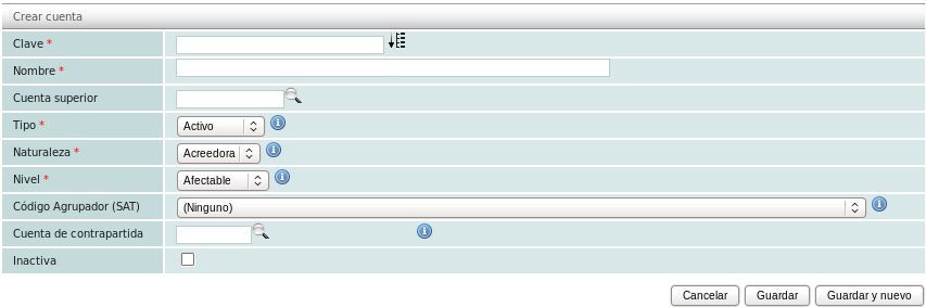 Para agregar una nueva cuenta dé click en el botón "crear cuenta" ubicado en el menú "Acciones".